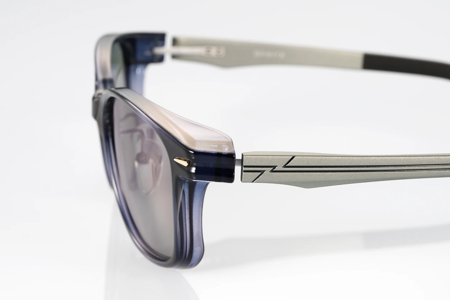 アルミ合金&βチタンヒンジを組み合わせたSHADEの金属テンプルを活かし、視界の違和感が少ない4カーブレンズ仕様の新たなデザインへ。顔に沿うラインとナチュラルな掛けやすさを狙い、軽量な樹脂素材で立体的に成形したフロント。複合素材のシナジーで高めた掛け心地の安定感や重量バランス。質感の違いから生まれるコントラストが、表情を引き締める。